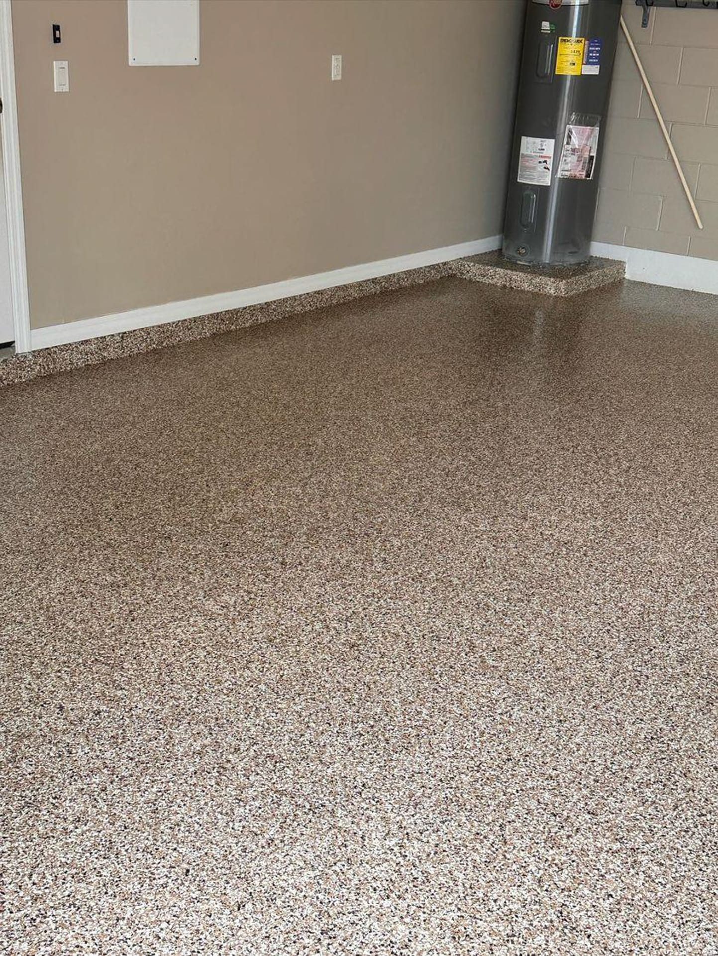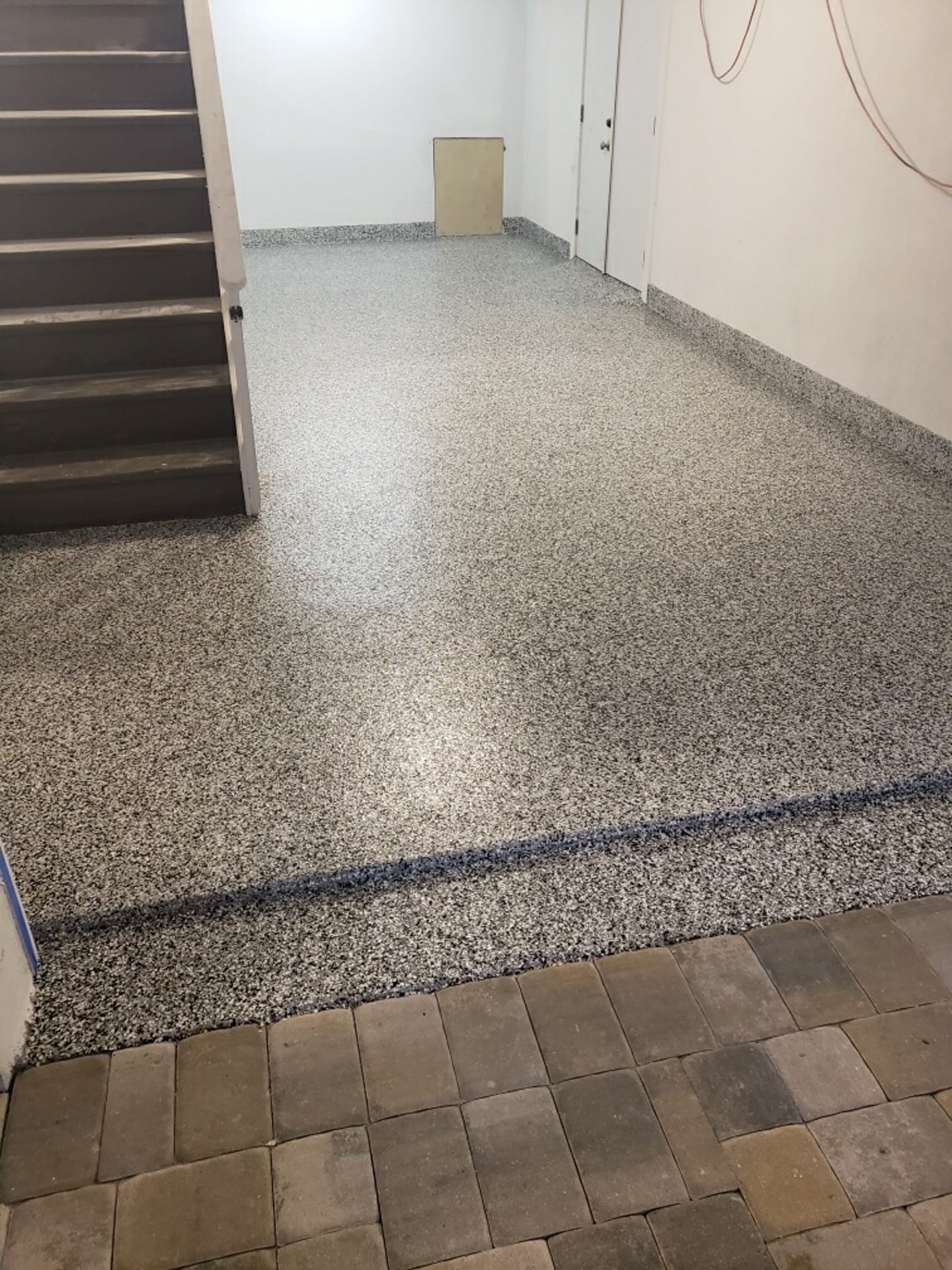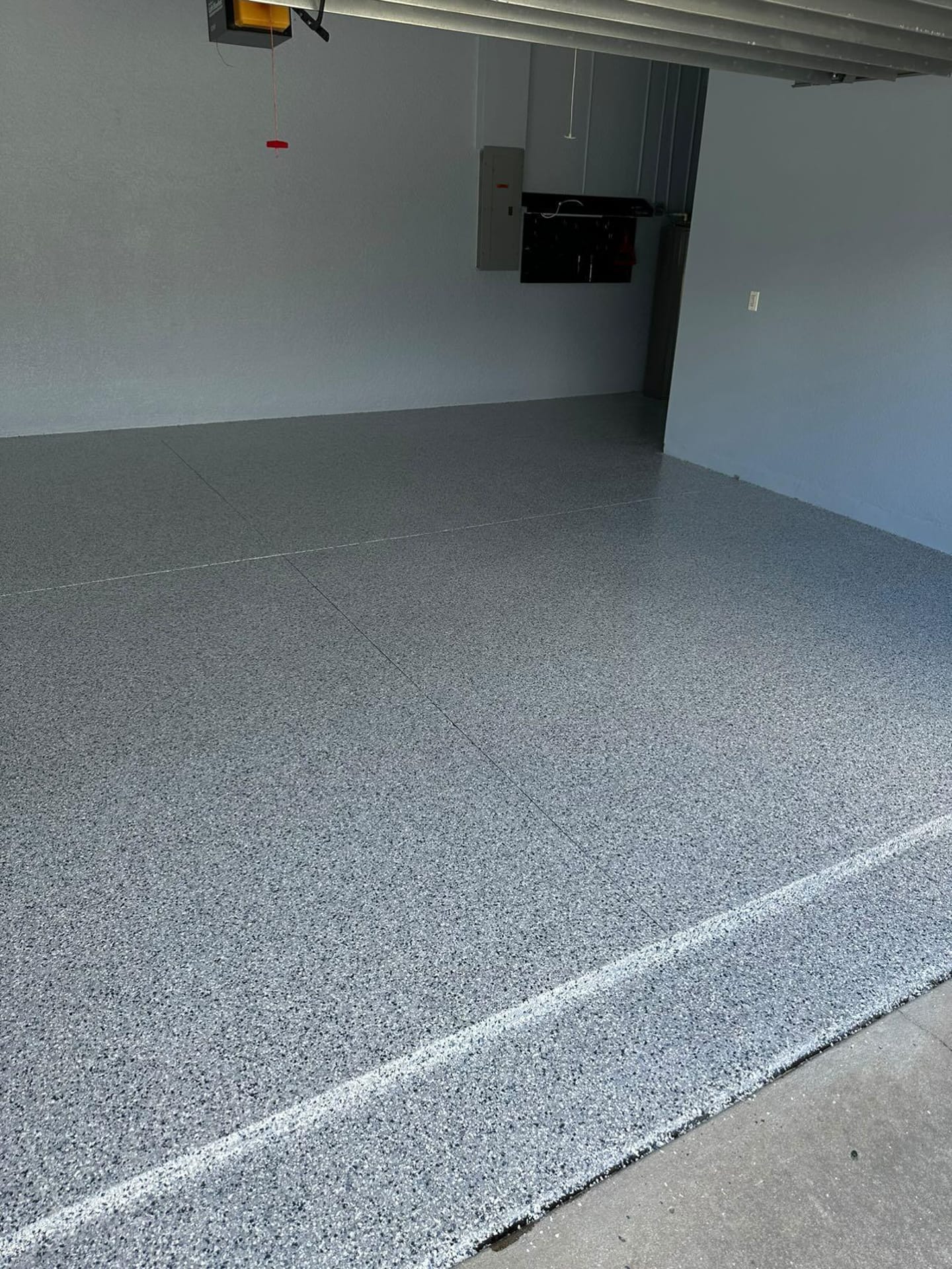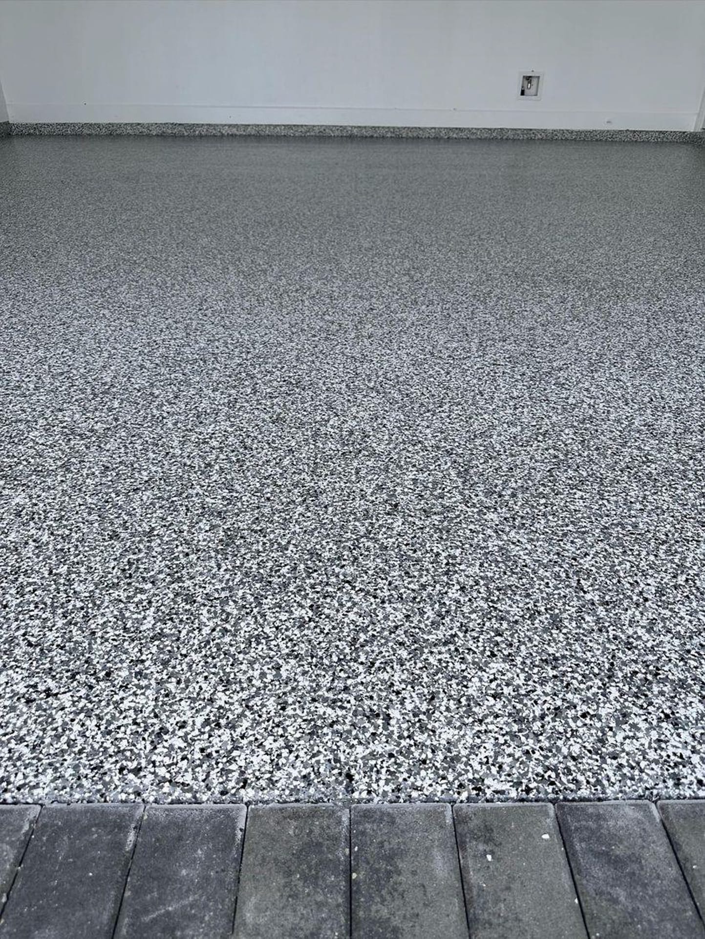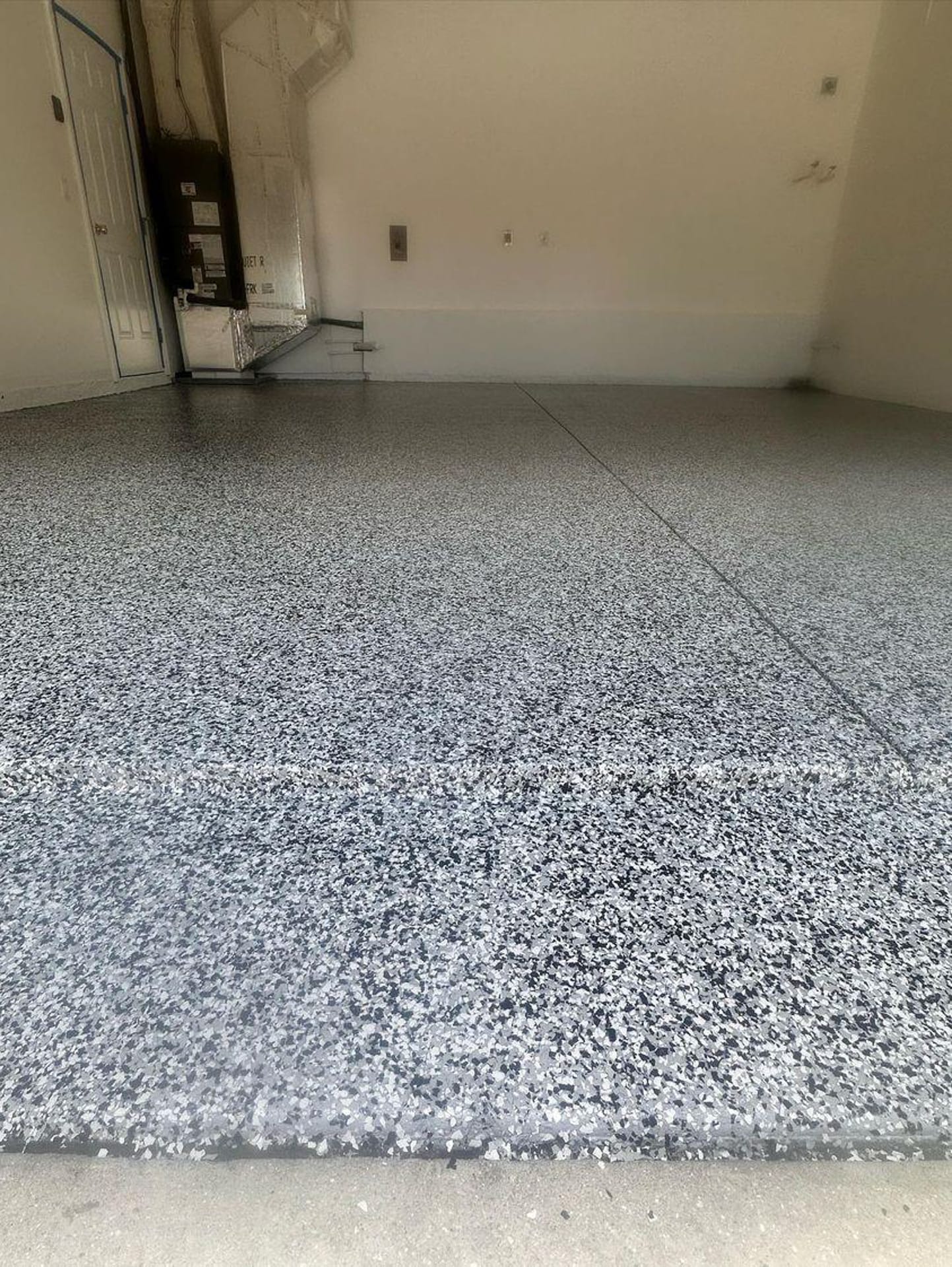 Many people use the term “flake epoxy” even when the topcoat we’re using is actually a polyaspartic coating—a newer, more advanced version of traditional epoxy. Polyaspartic cures faster, holds up better in UV exposure, and offers more long-term durability, which is why we often recommend it.