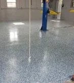Polyaspartic flake floor installed in a boutique retail space to create a clean, durable finish that complements the brand aesthetic.